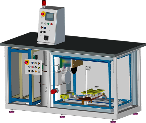 Система линейного перемещения рабочего стола с установленными на нем для проверки приборами имеет три оси перемещения рабочего стола (X, Y, Z) и осуществляет его вращение.